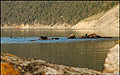 Проснулись в семь часов утра от криков нерп и плеска воды. Утро теплое и солнечное. Нерпы облюбовали прибрежные камни, подставляя свои толстые бока ласковому солнышку. И молодняк резвился тут же – взбирались на камни, снова плюхались в воду. Первая мысль – сфотографировать. Искал фотоаппарат, стараясь производить как можно меньше шума. Нерпы очень осторожные животные, близко не подпускают. При приближении человека ныряют в воду и предпочитают наблюдать из воды на почтительном расстоянии. Мне все же удалось сфотографировать их из естественного укрытия, которое образовывали огромные камни и пара бревен на берегу. Довольные результатом начали собираться в дорогу, в 10:20 отплыли. Картина однообразная кругом скалы и неприступные берега. Примерно через семь километров в 12:30 подплыли к мысу Ижимей. По обозначениям на карте мы знали, что впереди шестикилометровый прижим. Волнение усиливалось, когда мы обогнули мыс, на нас обрушился шквалистый ветер. Грести было невозможно, ветер выбивал весло из рук и мы стали искать место для причала. Шли очень близко от берега и тут увидели две галечные отмели разделенные между собой узким перешейком. Изрядно понервничав и потрудившись, мы наконец высадились на берег. Это был участок суши длиной метров тридцать, шириной десять метров, с отвесной скалой образующей у подножия небольшую квадратную пещеру. Спасались от ветра в пещере шесть часов. Когда ветер стих поплыли дальше. Через два часа увидели хорошее место для стоянки – не доходя м. Шунтэ-Левый. В небольшом распадке в лиственичном лесочке мы обнаружили кострище, стол и лавки, хорошие площадки для палаток, неограниченное количество дров в лесу. Пока ставили палатку, купались, сумерки сгустились. Разожгли огромный костер, с наслаждением подставляля озябшие тела, грелись у огня...