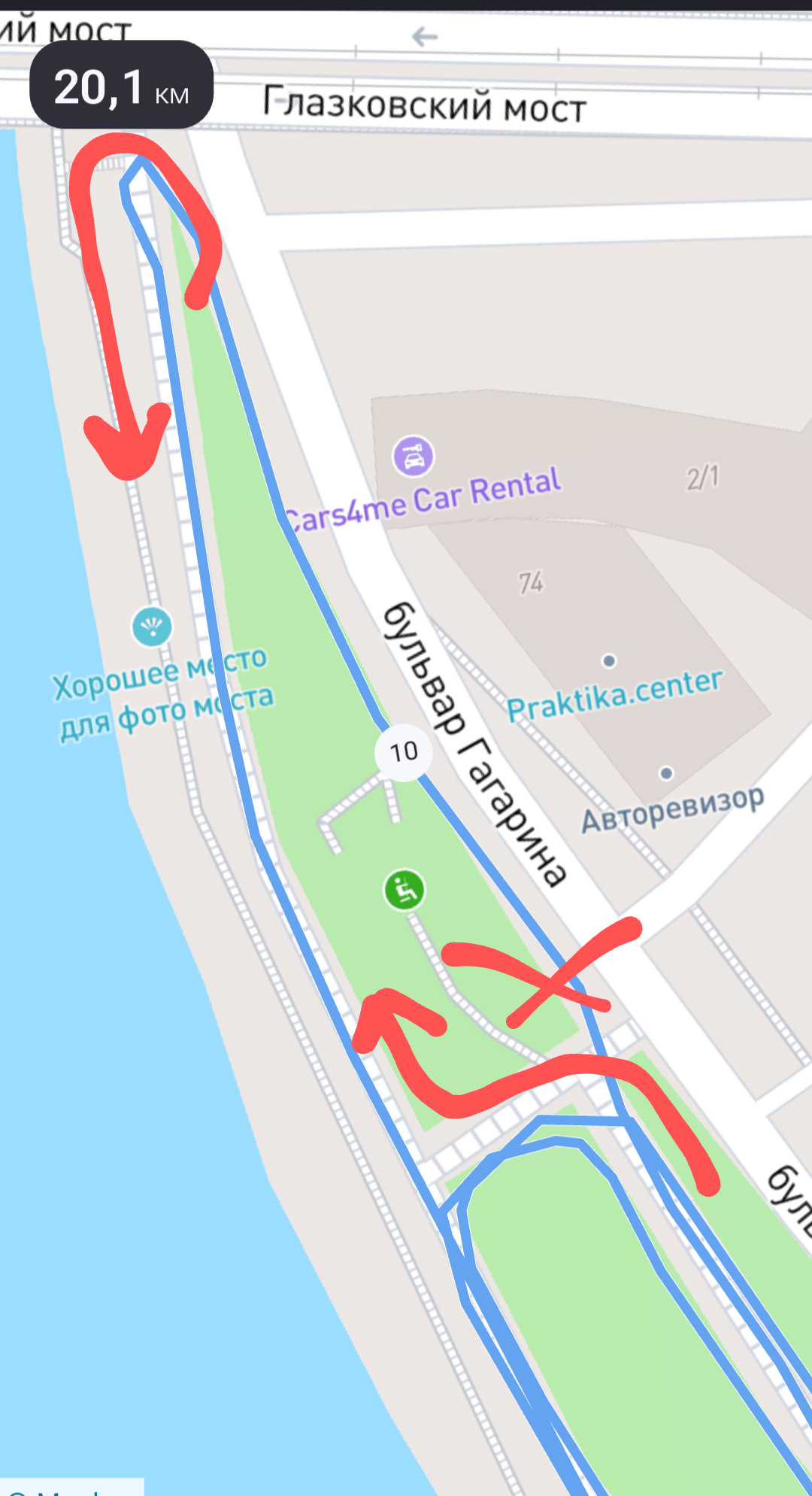 Может, все таки, там сворачивать налево на набережную и уже по набережной добегать до моста?