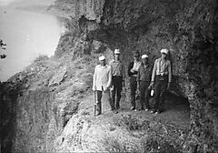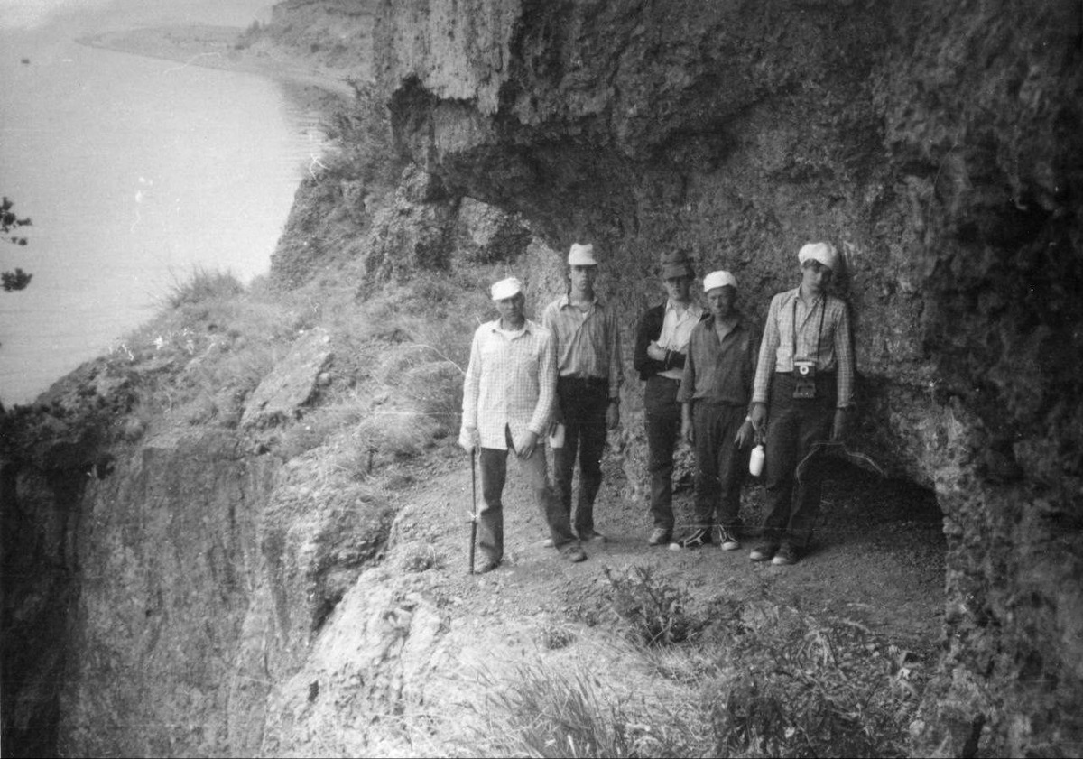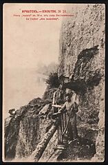 MiXamar [1473147]: фото интересное. Это точно, Чаячий утес, точно фото сделано до прихода советской власти и даёт представление о том зачем нужны были штыри на краю обрыва. Ну и как выросла сосна из маленького кустика в левом углу фото во вполне симпатишное дерево. С другой стороны охват фото слишком узкий, натурой и брёвнами, даже не дощечками, почти весь обзор тропы закрыт. Однако, если сравнивать это фото с современными, то весьма спорно утверждать, что все было сделано именно тогда. Полуарка имеет несколько иную, меньшую форму как и состав стенки. Скала, что с правой стороны имеет иной уклон, больше похожий на то, что тропу расширяли. Как пример с чем сравнивать