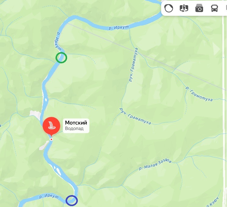 Не поверите, но на самом деле порог мотский (если я правильно понимаю его положение) уже давно нынче на снегоходе пройден. На рисунке синим кружком обозначено место выхода маршрута на Иркут, а зелёным - то место, где переметенная снегоходка сделала разворот на 180, то есть до этого места я наощупь по щиколотку двигался по твердой подложке, которая местами становилась явной, более того, на ней в этих местах наблюдались три или четыре лыжных следа. И только в районе зеленого кружка (примерно 8 км от выхода на Иркут) началась тропежка с нуля.
