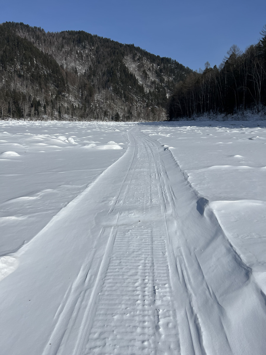 Последние два года Иркут вставал очень ненадежно, и если два года назад это еще было проходимо (до Выгузова), то в прошлом произошел полный ахтунг. После выхода на лед обычно шикарная снегоходка, но она действительно в 75% моих забегов по Антипереезду поворачивала обратно примерно на середине пути по Иркуту до Выгузова и оставшиеся до него пять-семь км приходилось тропить по глубокому снегу. А в прошлом сезоне Иркут вообще местами не встал, образовалось несколько полыней на всю ширину русла, которые приходилось обходить по заросшему кустами берегу. Думаю, в прошлом сезоне я был единственным кто там вообще смог пройти.