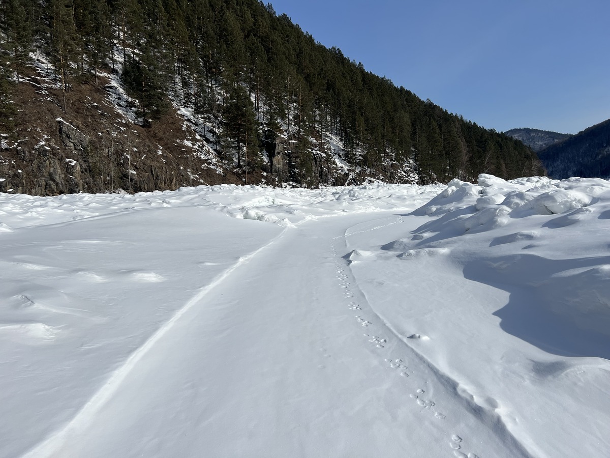 Самое интересное, снегоходчики катают по стрежню -там нет торосов, тропежка по стрежню не особо и сложная, но, чаще всего, там и попадаешь в глубокую наледь - все прикрыто снежком, и, с разгона, плавно опускаешься вниз, резко выдернуть лыжи не получится, ботинки наполняются холодной водичкой. Ладно, если это в одном - двух местах, а так ползешь по торосам, ткнешься на стрежень -а там опять водичка. Я теперь, перед походом в Шаманку, позваниваю в тамошний леспромхоз и интересуюсь у народа, есть ли снегоходка на Быструю, хоть какая-то гарантия, что не попадешь в глухую тропежку...