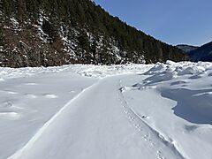 Далее по Иркуту по переметенному же снегоходному следу 8 км в режиме постоянного поиска этого следа полутропил. И когда осталось на так и много до Выгузова - 5-6 км, след действительно развернулся на 180. Был удивлен: неужели Владимир через 8 км развернулся и пошел на Малую Зазару? Ну а я был заряжен на полное прохождение и не задумываяь пошел дальше. Торосы есть, но их намного меньше чем обычно. Много где просто ровная заметенная поверхность. Иркут стал идеально по сравнению с тремя прошлыми годами, даже льда голого почти не видно, открытой воды тем более. И единственное, что мне портило жизнь - свежий после пурги снег на всей протяженности маршрута. Приспособился тропить по стрежню, там снег неглубокий, маневрируя между торосами. И когда вышел на левом берегу перед Выгузова на дорогу - думал уже все. Однако по этой дороге никто с начала зимы не ездил, и проваливаясь по колено, пришлось тропить и здесь, стало даже хуже чем на Иркуте, однако возвращаться не стал, решил потерпеть. Выяснил, что по старым заметенным (как я тогда думал собачьим) следам идти проще. Так прополз еще два километра. И понял, что если через перевал пойду (а там есть хотя бы накатанная дорога), то даже так не успею к 19:00 в Шаманку к автобусу.