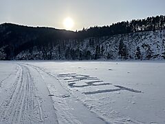 Зато получилось рассмотреть щит в устье Зазары, снова пройтись по волчьим следам, обойти подкову Иркута по льду без срезания через Выгузова (спойлер: этого лучше не делать, получается лишний километр и еще там напротив Выгузова самый неприятный торосняк), ну и, наконец, не торопясь пройти Иркут по снегоходке и прийти в Шаманку без угрозы опоздания на автобус. За три км до Шаманки еще встретил крутого бегуна, который по зафирнованому снегоходному следу очень быстро пробежал мне навстречу, а потом, через минут двадцать, еще и догнал на обратном пути. Я был впечатлен. Еще наконец-то нашел в самой маршрутке и сфотал расписание автобуса Шелехов-Шаманка.