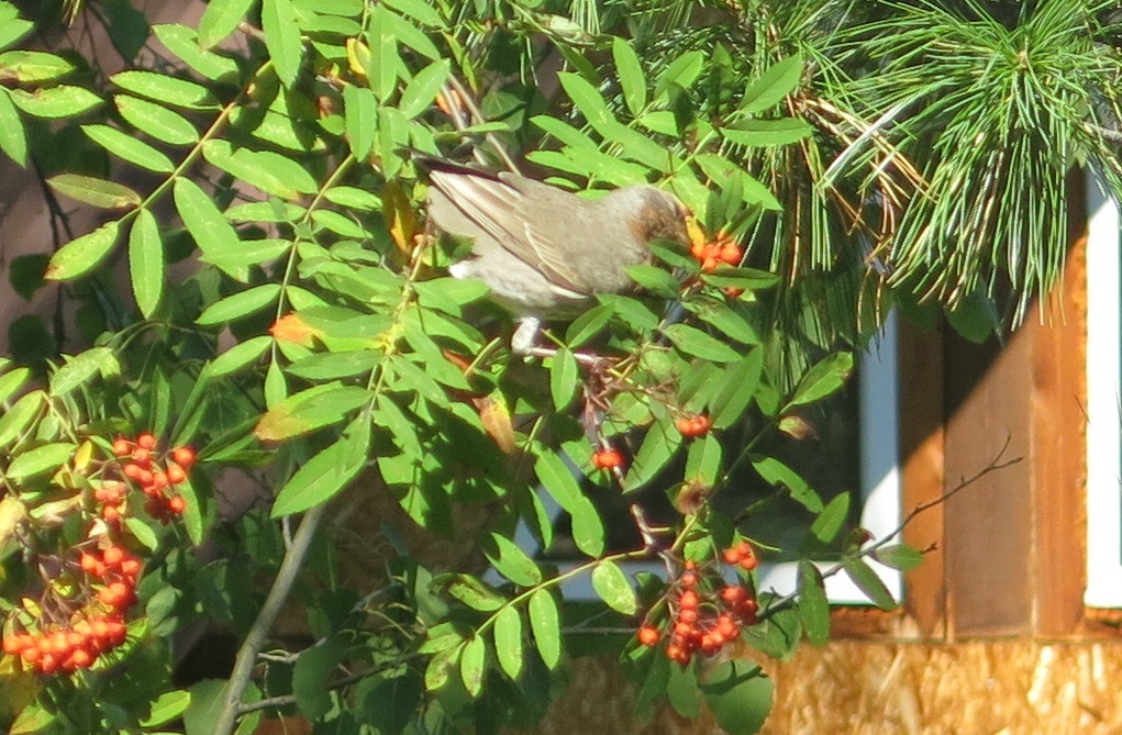 Повкуснее они уже склевали. Зачистили иргу. Я повесил китайского воздушного змея, он парит как орёл, но уже было поздно, жалкие остатки не успевшие созреть. А рябины и черёмухи не жалко, я на них видов не имел. Черёмуху они сожрали первой, видимо потому что первая созрела.