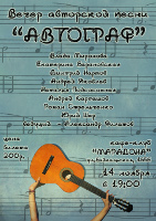 14 ноября в 19:00. Кафе-клуб "Марадонна" Байкальская, 165 "б" ост."Лисиха". Душевное тепло и веселое настроение гарантированно! Исполнители: Влада Миронова, Екатерина Барановская, Дмитрий Нартов и Андрей Яковлев, Наталья Подсосонная (Мявча), Андрей Карташов, Роман Стрельченко и Юрий Шер.