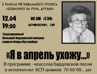12 апреля в 19:00 в зале ИСЭМ (СЭИ) по адресу ул. Лермонтова 130, состоится концерт памяти Фиры Лустенберг. В программе классика бардовской песни в исполнении КСП-шников 70-60-90…ых. Принимают участие исполнители, члены КСП «Мост» из Иркутска, Ангарска, Братска, Саянска, а также приглашенные исполнители. Вход свободный