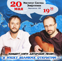 Иркутская Лига авторской песни приглашает 20 мая (понедельник) на концерт дуэта Дмитрия Нартова и Андрея Яковлева. Ожидаются много новых песен и хорошо забытые старые. Место проведения - Институт Систем Энергетики (ул.Леромонтова, 130, ост. "Академгородок").