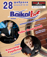 28 февраля в кафе Марадона пройдет концерт зимнего арт-фестиваля Baikal-Live. Выступают поэт, автор песен, музыкант, артист Павел Фахртдинов и гитарист-виртуоз Александр Родовский. Начало в 18:30.