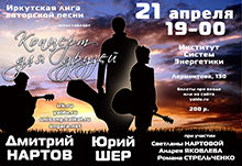 Друзья после затяжного молчания ИЛАП снова проводит концерт! Приходите 21 апреля послушать Дмитрия Нартова и Юрия Шера. Также в концерте примут участие Андрей Яковлев, Роман Стрельченко и Светлана Нартова.