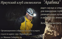 Хочешь стать исследователем неизведанного? Тогда тебе к нам! Иркутский Клуб спелеологов "Арабика" проводит курс молодого исследователя пещер. 2 месяца учебы на собственном учебном полигоне и шанс пополнить одну из самых сильных команд спеологов в России, возможность научиться работе с веревкой, картами пещер, любым альпинистким и туристическим снаряжением. 15 марта в 19:00 - в здании клуба - водонапорная башня (микр. Первомайский, ул.Мамина Сибиряка, 6а) организационное собрание