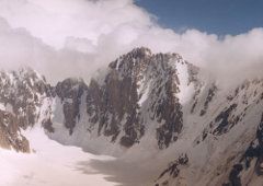 Я бежал вверх от бергшрунда,(трещина в снежно-ледовом склоне) по крутому снежному склону, на скользящем, по пробитой ребятами тропе, с большим рюкзаком. Крутизна 40 градусов. Перила из трех связанных веревок. Сто двадцать метров до перестежки. Глубокая ночь. Яркая Луна. Черная стена горы делит небо пополам. Высота под 4000 метров