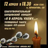 Иркутский областной КСП "Мост" приглашает 12 апреля в 18:30 (ИСЭМ ул. Лермонтова 130) любителей бардовской песни на благотворительный концерт посвященный памяти КСП-ешников - "Я в апрель ухожу". В программе концерта - классика жанра и не только. Собранные на концерте средства пойдут на организацию III открытого городского детско-юношеского фестиваля бардовской песни "Алый парус - 2019"