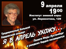 Иркутский областной КСП «Мост» приглашает любителей авторской песни на традиционны большой бардовский концерт «Я в апрель ухожу…», посвященный памяти Фиры Лустенберг и других ушедших бардов. Разговор со зрителем «в изложении нежных нот» о людях, которые стояли у истоков движения которые пели, любили и несли бардовскую песню «в народ», о неисправимых романтика, «физиках и лириках» будут вести участники областного бардовского движения.