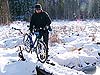 Пока друзья внизу подтягивали узлы и переодевались я заехал на лесовозную дорогу и попытался проехать пару раз туда-обратно по колее... и понял, что сильно заблуждался по поводу своих возможностей. Велосипед никак не хотел ехать туда, куда я его направлял. Попадание одного колеса с натропленной колеи в снег немедленно вызывало скольжение юзом и лишь к концу путешествия я более или менее научился маневрировать – жёстко держать руль на скорости и втапливать на педали, когда снег обволакивает покрышки и тормозит движение. Пока же – даже трогаться с места было