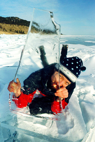 Екатерина Степанова прячется за льдину. Западное побережье оз.Байкал в районе скальника Скрипер.