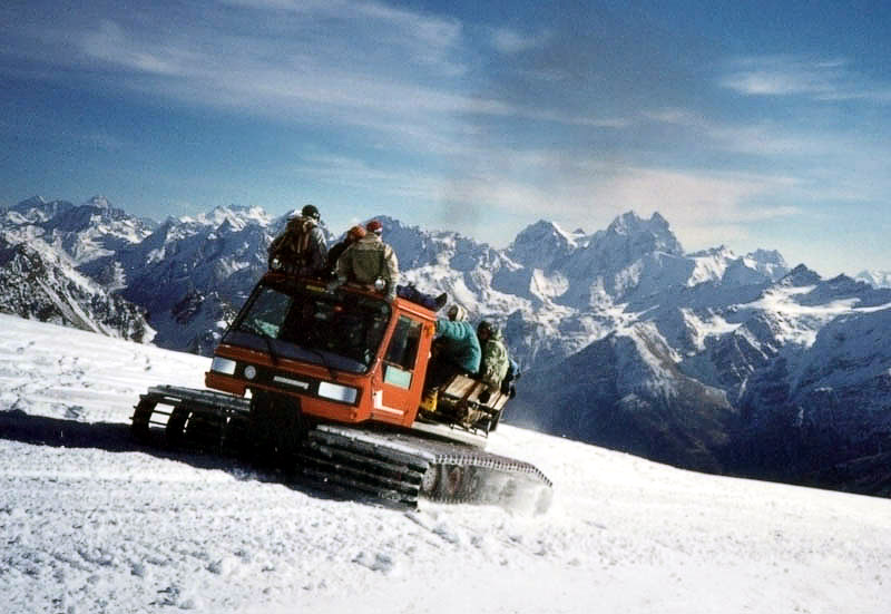 Ратрак везет сноубордистов по склону Эльбруса к началу спуска, высота около 4000 м. На заднем плане гора Ушба.