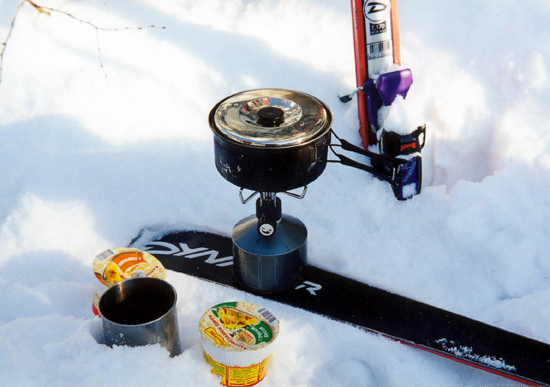 Готовим обед на газовой горелке посреди Мамайских снегов. Лыжа в качестве подставки на пухляке. Хребет Хамар-Дабан.