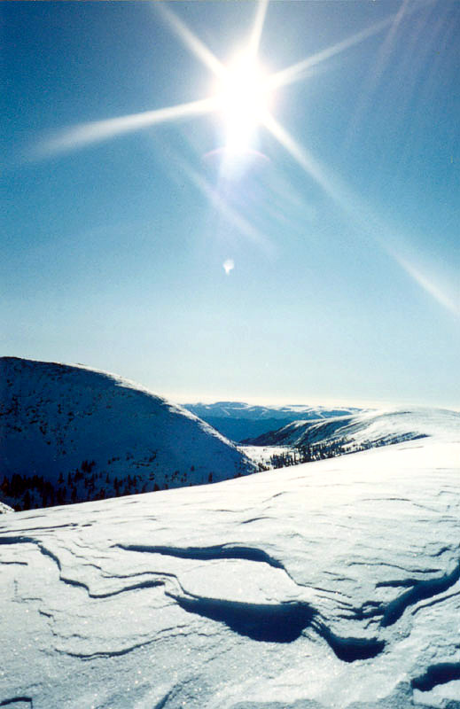 Яркое солнце на перемычке перед пиком Черского. Хребет Хамар-Дабан.