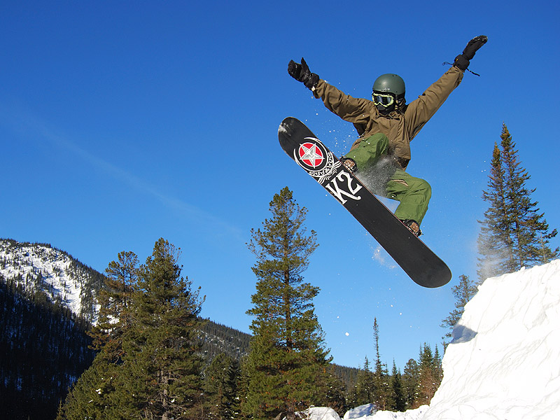Сноубордист сигающий с рукотворной кочки. Ущелье реки Мамай. Открытие сноубордического сезона. Ненавязчивая реклама "К2"