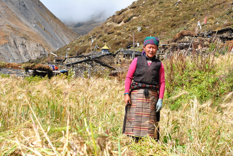 Деревня Самдо. Женщина одета в традиционный тибетский самотканый суконный фартук. Сукно изготавливается из ячьей шерсти, затем красится в разные цвета. Чаще всего фартук просто полосатый и очень яркий, без каких либо узоров. Носят такую красоту только замужние женщины.