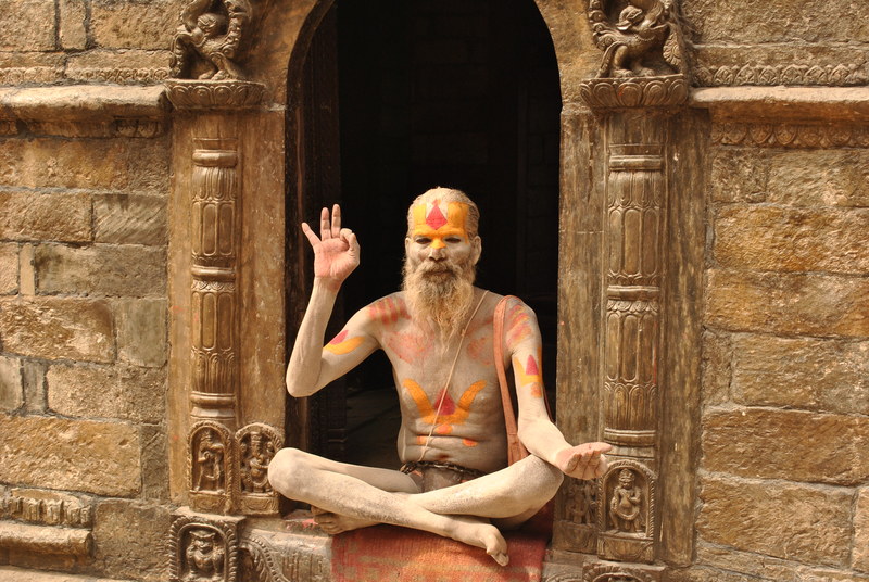 Катманду, комплекс Пашупатинатх. Этот человек покровитель бога Шиву. Он отказался от всех благ жизни и живет в храме, молится, вот так позирует и берет за это деньги.