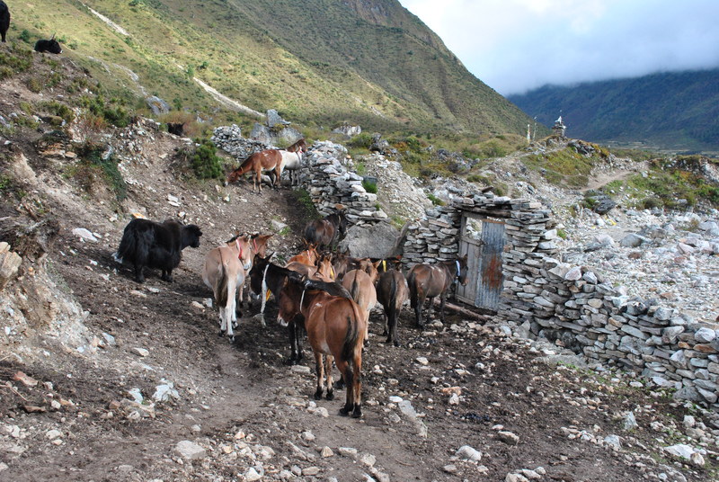 Вечер, всем хочется домой. Мулы, лошади и яки стоят у входа в деревню.