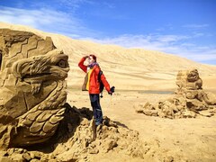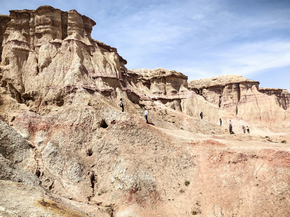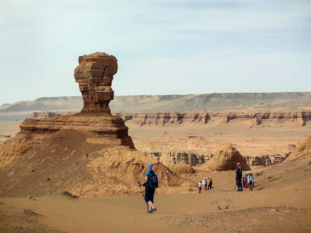 Полуденный зной морил в сон, за окном мелькают выветренные камни причудливых форм. Еще несколько часов и мы на месте, среди песков и красных хребтов, находящихся в котловине, сплошь размытой водой. Бурые пески с пышными вкраплениями столетних саксаулов и тополей, кажутся оазисами посреди вымершей местности. Некоторые барханы настолько правильно выветрены, что имеют гладкие и ровные грани.