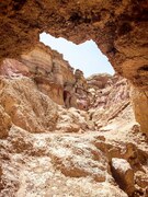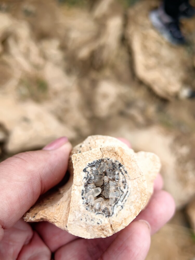 Мчим по песчаной извилистой дороге, точнее есть направление, дороги нет, она у нас просто в голове. Вокруг причудливые камни, горные хребты, уходящие в горизонт и сливающиеся с небом. Внезапно машина начинает буксовать, скрипеть и мы садимся глубоко в песчаную яму. Сначала пытаемся вытолкать машину своим экипажем, но четыре хрупкие девушки переоценили свои возможности. И только после подоспевшей подмоги, коллективно, удалось машину вытолкать из зыбучих песков, раскапывая колеса. Внезапно появляется предложение, не возвращаться сразу на трассу, а заехать ещё в одно местечко неподалёку, где недавно работали палеонтологи и попробовать поискать место их стоянки и раскопа. Бесконечно ныряя из одной канавы в другую, мы наконец-то находим примерное направление, по которому нам нужно пройти ещё два километра пешком. Смотрим вдаль и понимаем, что путь будет не простым. Впереди простирается гигантский каньон с размывами от 20-50 метров в высоту. Мы начинаем гонку за монгольскими сокровищами. То спускаясь на дно размытых водой расщелин, то карабкаясь по песочным откосам, все в поту и под пилящим солнцем, неутомимо идём с надеждой нового открытия. Таких обрывов и подъёмов пришлось преодолеть несколько. И какова была наша радость, когда кто-то из толпы крикнул: «Нашёл!»