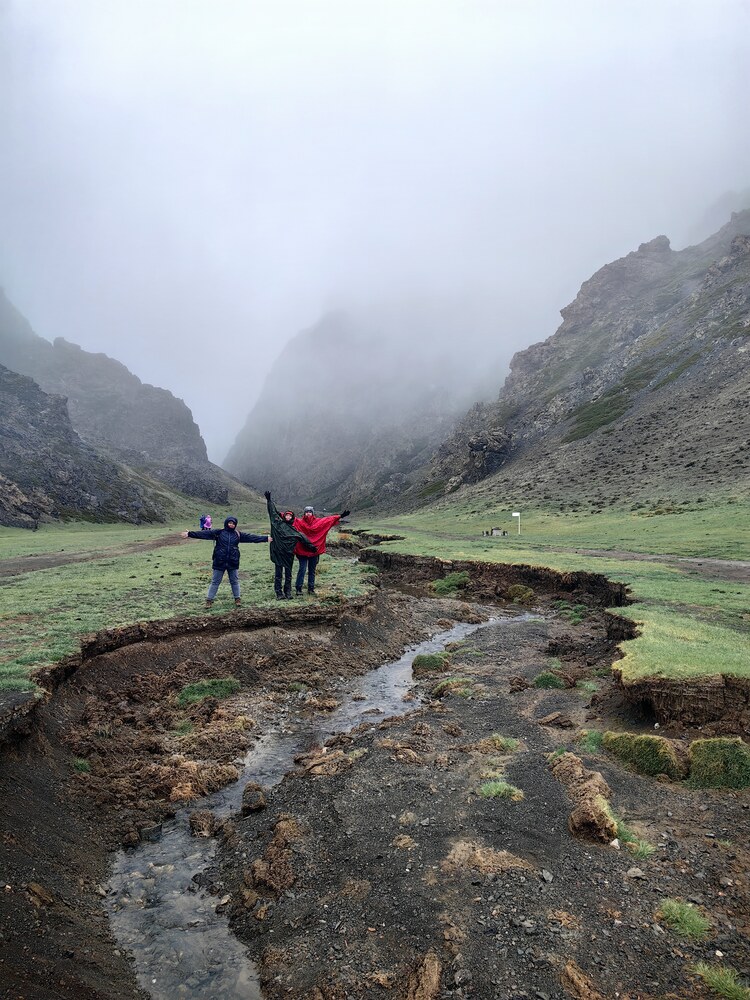 Все не вечно, не вечен и снег. Позавтракав бараньей лопаткой, а кто-то кашей отправляемся в путь. «Три прекрасных» провожают нас туманом и легкой моросью. Спускаемся по заснеженной каше с перевала и попадаем на зеленые, сочные пастбища, украшенные вдоль дороги цветущими ирисами. Даже не автомобильной заправке цветут цветы. Дальше начинается адские кочки (это мы свернули с асфальта) и нам кажется, что это, «то самое» бездорожье. По пути верблюды, колодцы, скудная степь и дождь.