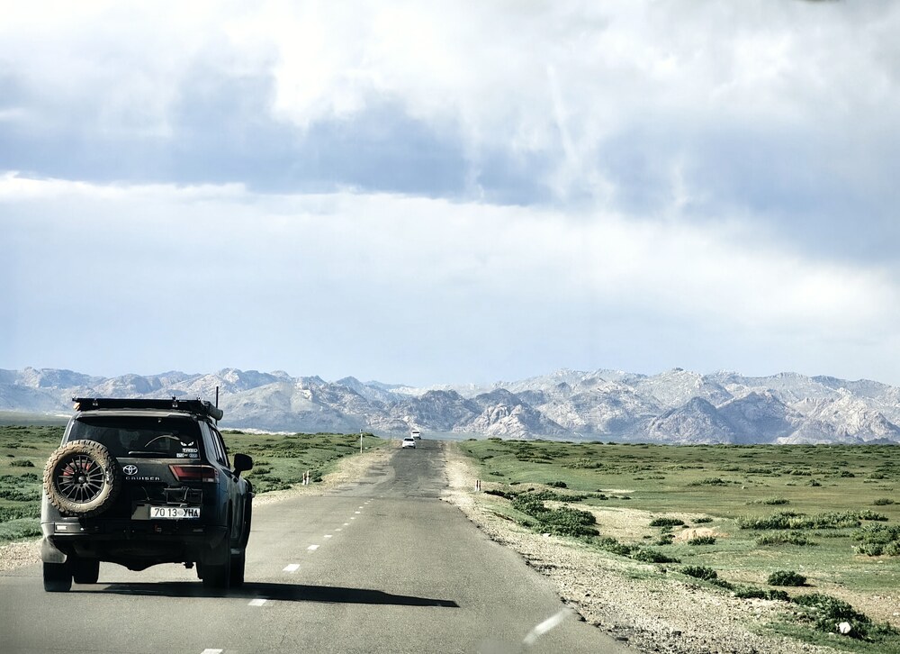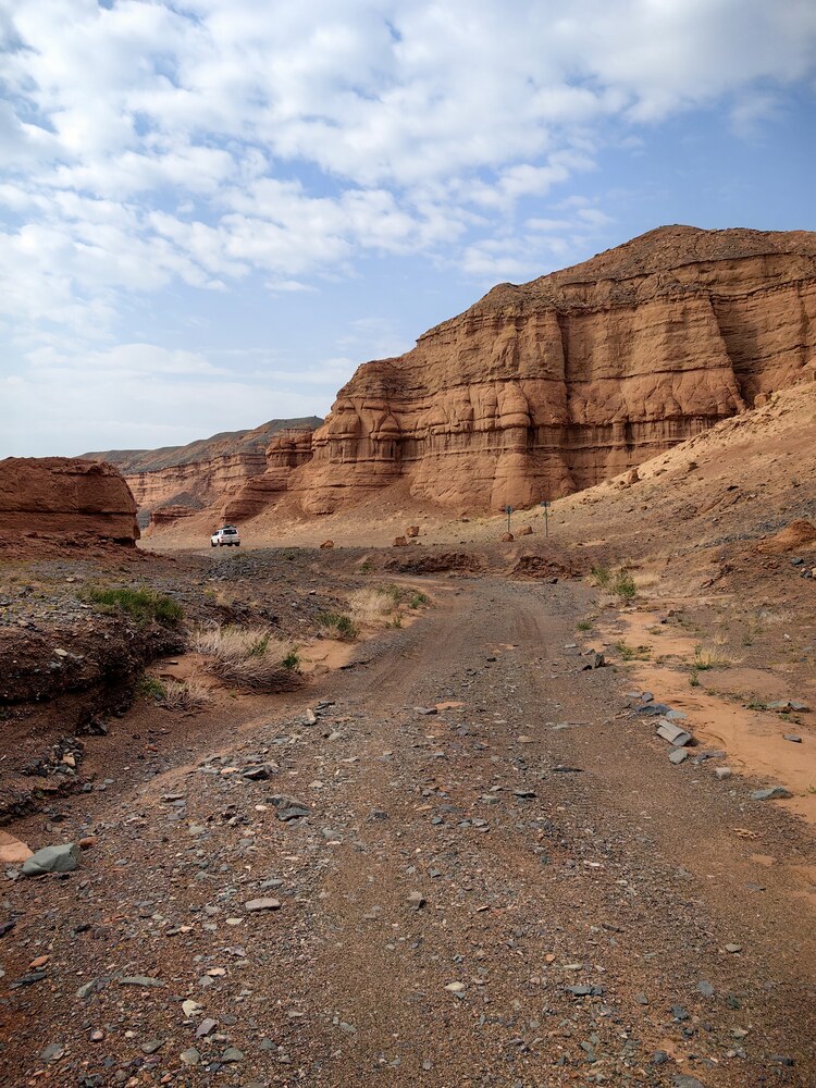 Ветер свистел, и погружал песок, который он нес вместе с собой во все микроскопические трещинки, которые встречаются на его пути. Любые вещи, оставленные в пустыне, заметает песком за несколько часов или уносит далеко и навсегда. На небе висели тонкие и взрыхленные облака, по степи неслись смерчи и ветер завывал в окно машины. Через какое-то время мы выехали из песков и оказались среди песчаников, причудливых конгломератов и базальтов. На горизонте показалась куполообразная вершина похожая на потухший вулкан. Направление, которого мы держались в пустыне, плавно превращалось в хорошо накатанную дорогу. Дальше показалась равнина, с первым поселком и магазинам. Шоппинг всегда прекрасен после нескольких дней странствий без связи, пива и мороженного. За мрачной равниной, мы оказались среди зеленых лугов…Здесь уже стало понятно, что мы покинули царство песков, сольпуг, камня и щебня, сухих русел и каньонов. Перед нами раскинулись зеленые просторы, луга, где мирно пасутся табуны лошадей, а их хозяйки продают прямо на дороге прохладный кумыс. Упрямые сарлыки лежат вдоль дороги, откинув свои коротенькие хвостики, и жуют нескончаемую жвачку.