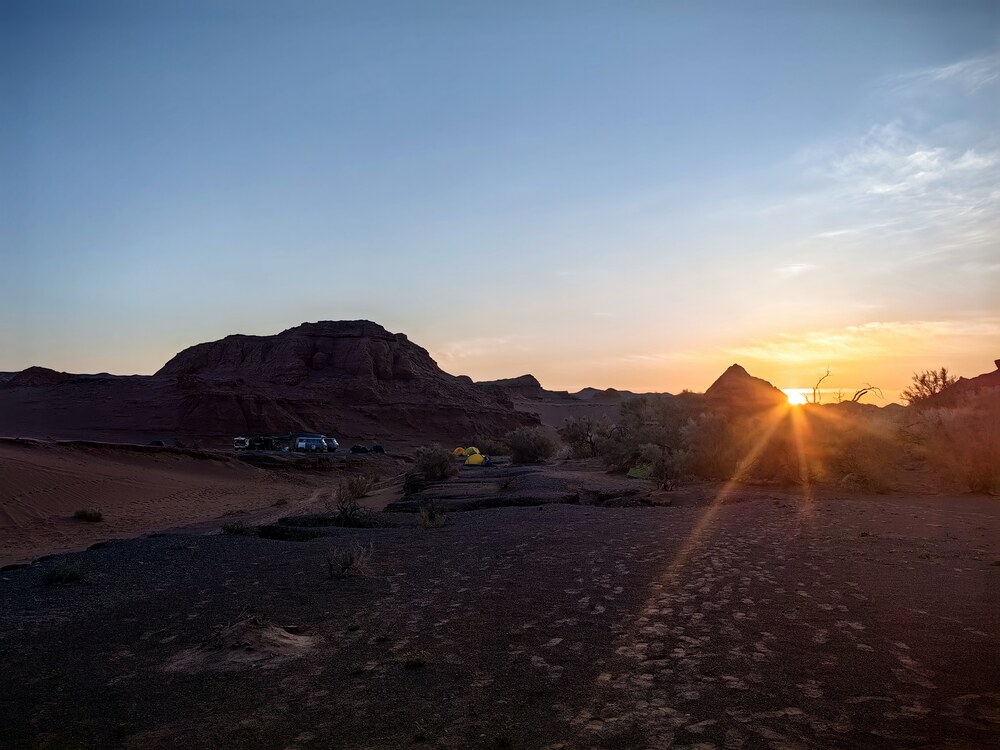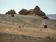 Дальше мы пересекаем пески в самом узком месте и даже не застреваем! Впереди нас ждет поселок, расположенный среди черных базальтовых хребтов — красивейшее место. У нас как всегда шопинг, будуар и заправка бензином и водой. Нам машут из окон ребятишки, продавцы скромно улыбаются, а пастухи на мотоциклах, разглядывают нас с ног до головы. После сомона дорога превращается в направление. Джейраны мирно пасутся не далеко от дороги и даже разрешают рассмотреть себя в бинокль. Смеркается. Полупустыня превращается постепенно в пустыню. Причудливые саксаулы, перегораживают нам нелегкую дорогу. Куропатки – одни из немногочисленных представителей Гобийской фауны, (в простонародье – курочки) буквально бросаются нам под колеса. Красные пески – предвестники юрского периода, говорят нам, что скоро мы окажемся в легендарной местности.