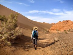 В какой-то момент облака прояснились и на горизонте появились темные силуэты гор, а на их фоне желтые перекаты округлой формы. Песочные горы тонкой полоской уходили в горизонт и сливались с облаками в тонкую полоску. Ну теперь мы точно в пустыне?! Утром просветы на небе и мы отправляемся на самый высокий бархан, который находится на высоте 1800 метров. По мокрому песку преодолеваем 300 метров крутого подъема и теперь мы точно в Гоби! Пески Хангарыл Элс простираются среди гор примерно на 300 км. и считаются самыми большими в пустыне. Температура в песках от -40 до +40. Нам повезло, сегодня примерно +15. Не смотря на это наши попутчики пытаются съехать с бархана на линолеуме, и как говориться: «Скатертью…» – доедут только ноги!